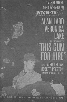 Well, all right, perhaps Saturday's feature isn't that spectacular: Tugboat Annie Sails Again, even though it has Jane Wyman and Ronald Reagan, but check out the rest of the week. On Sunday it's the reformist classic I Am a Fugitive from a Chain Gang, with Paul Muni; Monday is the bullet-riddled This Gun For Hire, starring Alan Ladd and Veronica Lake; Tuesday, William Holden and Joan Caulfield star in Dear Ruth; Wednesday, it's Olivia DeHavilland's Oscar-winning performance in The Heiress, with Montgomery Clift; Thursday is Cecil B. DeMille's Reap the Wild Wind with John Wayne, Susan Hayward and Ray Milland; and Friday winds things up with Bing, Bob and Dorothy Lamour in Road to Singapore. But it doesn't stop there! We've also got ads for next weekend: Saturday is For Whom the Bell Tolls with Ingrid Bergman and Gary Cooper, while Sunday's feature is the war drama Wake Island, starring Brian Donlevy, Robert Preston and William Bendix.It's a great lineup, but it's almost as important to note that each of the weeknight features are making their television premiere. Movies you haven't seen on TV before are a real attraction for viewers wondering what to watch. Every time I see something like this, I'm reminded again what a marvel television must have seemed like for people back then, bringing things like these blockbuster movies into one's living room (or bedroom). It's so easy to take it for granted when we can watch whatever we want, whenever we want (on our telephones!) but programming like this, with the World Series and a few boxing matches thrown in, might have even gotten some people to go out and buy a TV.