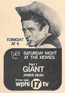 It's a big week for movies—I mean, a really big week—starting on NBC's Saturday Night at the Movies (9:00 p.m. ET) with part one of the TV premiere of Giant, the sprawling 1956 epic with James Dean totally overshadowing both Elizabeth Taylor and Rock Hudson, which isn't easy. The movie earned Dean his second posthumous Best Actor nomination; his first was for East of Eden, and the only movie for which he didn't get nominated was Rebel Without a Cause, which is a pretty fair track record, if you ask me. Giant concludes on Monday night, which leaves Sunday open for another TV premiere, that of 1969's True Grit (9:00 p.m., ABC), the magnificent Western which earned John Wayne his Best Actor Oscar. Judith Crist limes the supporting performances of Kim Darby and Glen Campbell, but "it's Wayne, eye-patched, wide in the waist and high in the saddle, belching and burping his way to gallant action and shrewd valor, who makes the movie his—by right indeed." Roger Ebert once pointed out that, sentiment aside, John Wayne deserved that Oscar, and if you want to see why, just watch it sometime.