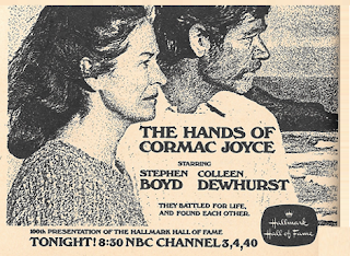 This Friday evening marks the 100th presentation of the Hallmark Hall of Fame, "The Hands of Cormac Joyce," starring Stephen Boyd and Colleen Dewhurst. (8:30 p.m., NBC) The decline of Hall of Fame from one of the prestige programs on television to telemovies barely suitable for Lifetime is one of the great disasters of television's evolution, but that's in the future; right now, Terrence O'Flaherty takes a look at the glorious history of the program,