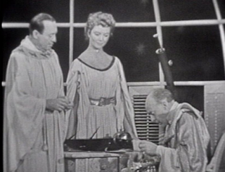 , the 1951 Christmas Eve opera. And how is it that Hallmark came to sponsor a program that wouldn't air until everyone had already purchased their Christmas cards? By taking the time to thank all those viewers out there who'd sent Hallmark cards.You can see this attitude expressed in the comments of J.C. Hall , the founder of Hallmark, who says he has "no interest" in ratings. "Just because people watch your show doesn't mean they are buying your product," he declares. "I'd rather make eight million good impressions than 28 million bad ones." And you get those good impressions from presenting quality programs, thanks in large part to director George Schaefer, "a director who respected the playwright, the actors and the audience and realied all three were linked in the success of any drama." From Schaefer's direction came "a succession of dramatic gems" including Hamlet, King RIchard II, Macbeth, The Corn is Green, The Taming of the Shrew, Man and Superman, Abe Lincoln in Illinois, That Fantasticks, The Tempist, and Blythe Spirit among them. And then there are the stars: Dame Judith Anderson, Mauric Evans, Katharine Cornell, Sir John Gielgud, Mary Martin, George C. Scott, Julie Harris, Richard Burton, and the husband-and-wife team of Alfred Lunt and Lynn Fontanne. Talk about a hall of fame of talent.