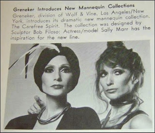 Here's Sally modeling for a line of mannequinsAs I said, quite a story, isn't it? So no sitting around at Schwab's Drugstore in a tight sweater waiting to be discovered; this, apparently, is how it is to be a starlet nowadays. And, especially as a model, she's had a good bit of success. But I know, you're all wondering how this story ends. I wish I could tell you, but the not-always-reliable IMDb has failed in this regard. For example, the episode of The Men from Shiloh that she did? According to IMDb, that was the other Sally Marr, Lenny Bruce's mother. Then there's an episode of the 1979 series A Man Called Sloane called "The Seduction Squad" that features international supermodels brainwashed into engaging in industrial espionage (which I suspect happens all the time)—"Sally Marr" plays one of the models, but considering that she was 73 at the time, I rather suspect that this could have been our Sally as well. And there's The Facts of Life Goes to Paris, made in 1982, and—hell, who knows what the truth of the matter is? It proves the importance of research—good research, not just easy research. There is more than one Sally Marr in the world.Yes, I know that with a bit of that good research and a little effort, I could get to the bottom of it all, but as much as I love all of you out there, I'm not about to spend hours of my life trying to find this out just to write one paragraph for this article. I'm sorry, but that's the way it is. Now, if any of you want to take it on. . . TV