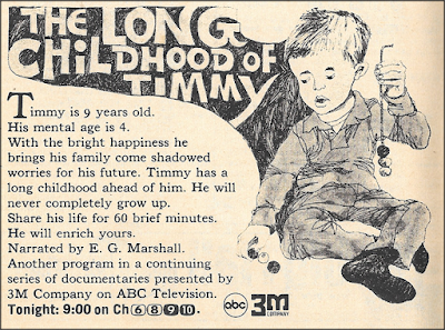 Monday, and the emphasis is on documentaries, beginning with Coach Bryant: Alabama's Bear (7:30 p.m., ABC), an hour-long profile of Alabama's already-legendary football coach Bear Bryant. Chris Schenkel gives viewers a look at Bryant's coaching style (including an interview with former Alabama quarterback Joe Namath), and reviews last season, when Bryant's defending national champions finished the season as the nation's only unbeaten, untied team, only to finish third in the final polls. (That finish became a prime motivator for Bryant to integrate the team.) Then, followng a break for Peyton Place, it's an ABC News Special entitled "The Long Childhood of Timmy," a report on the life of a mentally retarted child, narrated by E.G. Marshall.Tuesday is music night, starting with NBC's special presentation of The Beatles' A Hard Day's Night (6:30 p.m.). Judith Crist calls it a movie of "fantastic charm," with probing portraits of "four very likeable young men." Thanks to the movie's early start, you'll have time to check out ABC's revival of Armstrong Circle Theatre (8:30 p.m.), which originally ran from 1950 to 1957 on NBC and 1957 to 1963 on CBS, thus covering all the network bases. Unlike its earlier incarnation, however, this time it's just the umbrella title for a series of musical specials; previous presentations included Brigadoon and Carousel , both starring Robert Goulet, while this week it's Kismet , featuring an all-star cast that includes Jose Ferrer, Barbara Eden, Anna Maria Alberghetti, Hans Conreid and George Chakiris. Any resemblance between this series and the network's Movie Night is, I presume, entirely uncoincidental.