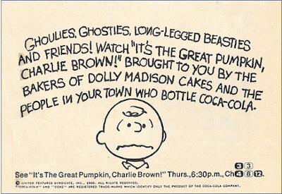 You can see the complete list here . In the meantime, we'll be watching It's the Great Pumpkin, Charlie Brown on Halloween night as we always do. I hope you'll join us, at least in spirit. After all, 'tis the night for spirits. TV