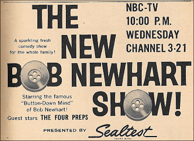 In any event, the buttons on the ad refer to Newhart's celebrated comedy album The Button-Down Mind of Bob Newhart, which won the Grammy as Album of the Year in 1961 (before that award was specified for musical performances). The album features most of Newhart's greatest bits, including the imaginary telephone conversations, and NBC must have felt this made him a natural for a variety show. As it turns out, it was not the variety format that suited him best (he also featured in The Entertainers, a failed variety show with rotating hosts, one of whom was Carol Burnett), but the sitcom. Admittedly, that might not have been so obvious back in 1961, but as we've seen since, Newhart was one of the first of many stand-up comedians to have a successful sitcom shaped around his act, or shtick. In Newhart's case, it happened successfully not once, but twice. Not bad at all.