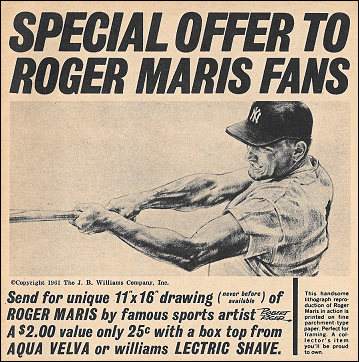 This "Special Offer to Roger Maris Fans" reminds us that Maris had just completed one of the greatest season any baseball player ever had, breaking Babe Ruth's famed single-season home run record.*