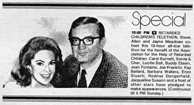 With the demise of Jerry Lewis's Labor Day telethon, the once-ubiquitous television fundraiser has pretty much been reduced to the occasional two- or three-hour special, usually following some kind of natural disaster. It wasn't always that way, though, and this week we see an example I wasn't aware of, for an organization I've never heard of. It's a New York City organization called the Association for the Help of Retarded Children (still existing today under the acronym