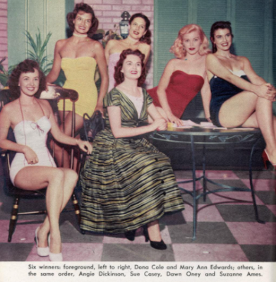 As you know from past experience, one of the questions we like to ask of stories like this is whether or not any of these young ladies amounted to anything. Not surprisingly, since the prize was appearing on the Colgate Comedy Hour, they all had careers of one sort or another. Suzanne Ames (far right on the cover) appeared in several movies, including Bells Are Ringing; Dona Cole (center) was in The Beast With a Million Eyes; Mary Ann Edwards was in Cowboy G-Men and Giant. And theAsn there's the young woman on the left. Recognize her? If not, try to imagine her with blond hair. Need more clues? She's from Kulm, North Dakota, hung out with the Rat Pack, was married to Burt Bacharach, and just celebrated her 89th birthday. That's right: Angie Dickinson. I'd say she had a pretty successful career, wouldn't you?