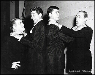 Staged or real? Only their agents know for sure.The sparks started during the rehearsal. Since the time had to be divided evenly among the various parties, and given that it was unthinkable that any two of the acts could appear in the same skit, that meant each one was allocated exactly eight minutes. Before you knew it, Eddie Cantor was complaining that Bob Hope was taking too much time for his monologue. He'd been up on stage for eleven minutes already! Furthermore, Hope was just mumbling his lines, intent on keeping any of his colleagues from hearing (and stealing) his jokes. Next, it was time for Bud Abbott and Lou Costello; they, too, mimed their way through their act. This didn't sit too well with their bitter rivals, Dean Martin and Jerry Lewis*, who sat in the otherwise empty theater carrying on a loud whispered conversation with some friends. Soon enough, someone asked—loud enough for the performers on stage to hear—"What's the matter with those two? They afraid you're going to steal their material?" After waiting a beat, Jerry replied, "What material?" When their turn came, Dean and Jerry threw their script out and proceeded to do a devastating take-off on the typical Abbott & Costello routines.