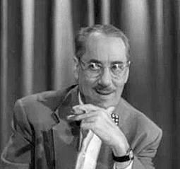 Marx enjoys the second career that television has afforded him. "Next to robbing a bank, it's about the easiest of all," he says of hosting You Bet Your Life. "But this is the culmination of years of hard knocks, believe me. Maybe I've earned this kind of job." He still remembers his struggle to make it in show business, starting in 1906 when he was 11. It's been a nomadic life, working the vaudeville circuit before making it big in Hollywood. But now he lives comfortably in Beverly Hills, spends time with old friends and his children, and hosting his weekly show. And after 40 years, he's learned to be unflappable, even when confronted with his sometimes colorful contestants, including a woman with two husbands named Bodovnic (must be something in the water), triplet sisters from Russia, and an Irish janitor working in a synagogue. "I've never been stumped yet," he says. "I guess those years of trouping do something for you.t t t