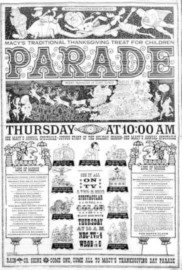 It's been said that in New York, people refer to it as the "Macy's Day Parade," such is the identification the parade has with Thanksgiving. There are other, and older, Thanksgiving parades; Detroit, Philadelphia, Chicago, and Houston come to mind. And, if you ask me, the telecast of the Macy's parade has suffered over the years; the floats and bands and balloons almost seem to take second place to the pop stars and dancers lip-synching their way through Herald Square. If I wanted to torture myself that way, I'd watch the Grammys. (I don't know if MTV has music anymore, but if it does. . .) And with the current crew from Today doing the announcing, the parade sometimes becomes unwatchable.But I come here not to bury the Macy's parade, but to praise it. No matter how bad the coverage may be (and whether you watch it on NBC or CBS, it's equally bad), I still have to catch a few minutes of it while flipping back and forth between the other parades. And when you strip away all that's annoying, it's still magically colorful. (Probably the best way to see it is to go to New York and view it from a point where the pop stars aren't warbling.) Take a trip through the years with the ads below, most of which have a prominent mention of the television coverage.