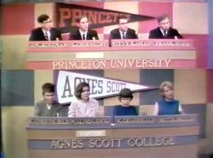 But even though it's old news by this time, I wanted to mention this, not only because it's one of the great stories in TV history, but because it also provides a nice little bookend to that Texas Western story above. Agnes Scott, like Texas Western, was a little-known school taking on a prestigeous opponent that considered itself a class above the rest; carrying the analogy a step further, Princeton was, in 1966, still an all-male institution, and one couldn't miss noticing the similarities between the two schools, Princeton and Kentucky, neither one appearing to have yet adapted to the changing times. There had been David vs. Goliath upsets on College Bowl in the past, but none, before or after, seemed to capture the imagination of people quite the way this one did. Reading the Slate story, you'll be charmed, I think by the accounts of the four women competing for Agnes Scott, particularly the remarkable story of Karen Gearreald, Agnes Scott's first blind student, and her recounting of how the winning answer came to her in a millisecond.