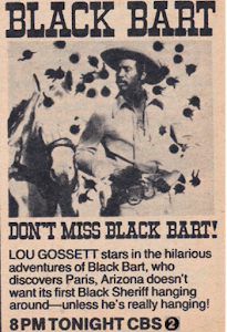And CBS aired the one and only episode of Black Bart ►on April 4th. Based on the AndrewBergman screenplay “Tex X” which after some tweaks by Mel Brooks, became “BlazingSaddles”. Lou Gossett is the Sheriff, Steve Landesberg plays the drunk sidekick character thatobviously pales compared to Gene Wilder. How could one resist the quarter- page pitch: “Thehilarious Adventures of Black Bart, who discovers Paris, Arizona doesn't want its first blacksheriff hanging around - unless he's really hanging!”Mel Brooks was not involved and the production was allegedly merely contractual to securesequel rights for Warner Brothers.Thanks, Hugh! A great look back at the well-known and the little-known. Feel free to share what else you're finding! TV
