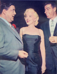 Bennett Cerf, publisher at Random House and Allen's co-panelist on What's My Line?, didn't need to write the words in his Encyclopedia of Modern American Humor, nor did Down You Go moderator Bergen Evans, whose collection of silly notions appears as The Spoor of Spooks and Other Nonsense. Books by Bob Hope, Dale Evans, Martha Raye, and Groucho Marx are among other tombs filling the shelves, and Arthur Godfrey, Frank Sinatra, and Liberace are said to be working on autobiographies. And then there's Jackie Gleason; the Great One, who's already mentioned once in this issue for the celebration in honor of his 39th birthday (that's him on the right, with Marilyn Monroe and her estranged husband, Joe DiMaggio), is working with Jim Bishop, whose last book, The Day Lincoln Was Shot, was a best-seller. Jackie, of course, only works with writers familiar with big subjects.l l l