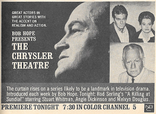 It's interesting, looking at this list. Just by looking at the names of the guests, you can usually figure out what shows they're associated with (George Burns and Connie Stevens in Wendy and Me, for example, or Inger Stevens plugging The Farmer's Daughter). And while some of them were real bombs (Valentine's Day with Tony Franciosa, Walter Brennan in The Tycoon), a fair number of them have entered classic TV folklore. ABC seemed to do particularly well with sci-fi/fantasy, considering Voyage, Bewitched and Addams, as well as Combat!, McHale's Navy, and The Fugitive, among others. Not all of them were long-running series (Addams ran a scant two seasons), but all of them were recognizable. I've mentioned this before, just a few weeks ago, in fact, but that's not bad for a network with a track record supposedly as weak as ABC.