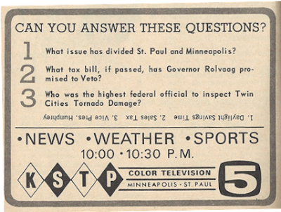 Middle of the week. Why did I happen to feature this day? I was looking for programs we don't usually see in the listings; the ill-fated My Living Doll, the brief As the World Turns prime-time spinoff Our Private World, some of the daytime shows I mentioned on Saturday. As we move into summer, and television's third season (the second season began in January), we'll probably see more unfamiliar titles; in the meantime, let's get familiar with these. The listings are from the Minnesota State Edition.2 KTCA (EDUC.)