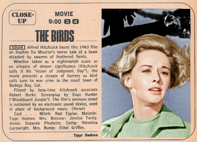 It's another big week for big-screen movies, starting on Saturday with the second showing of Alfred Hitchcock's horror classic The Birds (9:00 p.m., NBC), starring Rod Taylor (as character named "Mitch"? Gotta love that!) and Tippi Hedren, looking dazzling with one of the most cosmopolitan wardrobes in modern movie history. Judith Crist calls it "dull and plotless" except for the terrifying titular characters, but when you have them as your hook, what more do you need?Another kind of "bird" features on Sunday with the network television premiere of Otto Preminger's religious epic The Cardinal (9:00 p.m., ABC), combining the grandeur (and political intrigue) of the Catholic Church with sex, reform, civil rights, and the looming war. Tom Tryon stars as the young Bostonian headed for the red hat; among the all-star cast, John Huston stands out as the crusty Cardinal Glennon, a role which earned him a richly-deserved Best Supporting Actor nomination. Crist notes that the red-clad "birds" in this movie are, by far, outacted by their malevolent counterparts on Saturday night.