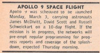 Throughout this week's issue are notices of possible programming pre-emptions due to the flight of Apollo 9, which launched on March 3 and is scheduled for splashdown on Thursday. Coming after the dramatic Apollo 8 trip around the moon last December, Apollo 9 represents the first test of the Lunar Module (in Earth orbit), and is essential for the success of the man-on-the-moon program. What's remarkable about this is the moon landing, on Apollo 11, comes up later this year. We've become so used to things taking a long time (which they always seem to do nowadays), it's still awesome to think that NASA could go from a first test of the LM to the actual landing in just over four months. l l l