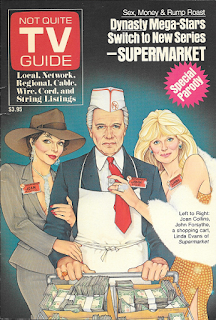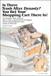 It's no surprise that Del Coronado's cover story is the mega-news that the mega-stars of Dynasty are jumping to NBC to star in "the biggest, dirtiest, most expensive adult drama of them all: Supermarket. It's the story of the King Kong supermarket (biggest in the world), owned by John Kong (John Forsythe), and his battle for supermarket supremacy against James Klooger (James Farentino), owner of the rival Klooger supermarket chain. So big is Kong that he has to have not one, but two mistresses: Joan (Joan Collins), who worked her way up from checkout girl to assistant manager of drugs and sundries; and Linda (Linda Evans), whom Kong discovered working in a dime store.The enormous cast of 75 regulars includes Barbara Stanwyck as Kong's ex-wife; Doug Barr, Michael Sabatino, and Matt Dillon as his sons; Heather Locklear, Valerie Bertinelli, and Jaclyn Smith ans his daughters; and Donna Mills and Tony Franciosa as the in-laws. There's also Peter Graves, Bill Bixby, Bette Davis, Lana Turner, Robert Stack, Hal Linden, Polly Bergen, Lloyd Bridges, Morgan Fairchild, Buddy Ebsen, MacLean Stevenson, Lorenzo Lamas—well, at this point it's probably easier to list the people who aren't in the series.