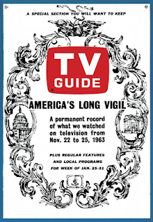 If I numbered the TV Guides in my collection, this would be Volume 1, Issue 1. Not only was it the first TV Guide in my collection, it was the one that introduced me to a brand new world, a whole 'nother way of thinking. It was The Land That Time Forgot, even though I didn't.I’ve mentioned in past discussions of the JFK assassination that my mother used to save things for me, things that she thought I’d want to look at when I got older. The afternoon Minneapolis Star was one of them, with the headline “President Slain”; this TV Guide was another. It contained a special section, “America’s Long Vigil,” an in-depth look at television’s coverage of the assassination and its aftermath, with a special forward by President Johnson.