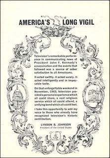 Throughout the weekend, on WLW-AM in Cincinnati, at every station break the announcer recited a variation of the same script, WLW and the Crosley Broadcasting Corporation asking listeners to "join with us in prayer for John Kennedy, his family, and President Lyndon Johnson." At ABC radio, Don Gardiner, a newsman given to a very formal style, announced the death of the president and, one suspects for his own benefit as well as that of the audience, says, "Let us pray," followed by a moment of silence. Would we hear that on a network today? Now, it's true that the public tends to turn to religion in times of crisis; 9/11, for example. And not to suggest that such revivals are insincere, but usually church attendance returns to normal after a few weeks. Conversely, during the JFK weekend, one reporter remarks how the churches are full, yes, with people saying prayers and lighting candles; but not as full as they are on Sundays. Would we hear that observation today?