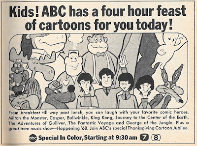 Well, here we are, the day after Thanksgiving. (Kind of funny to write that, since Thanksgiving was actually four days ago, in real time. Ah, the perils of the digital world.) As I mentioned on Saturday, one of the highlights of the day is ABC's annual cartoon festival, four hours of cartoons from the Saturday morning lineup. I always enjoyed this greatly, even though I didn't usually watch it; it was part of the fun of seeing shows outside of when you were used to seeing them. You get to thinking that tomorrow's Sunday, because today feels like Saturday. Then you wake up tomorrow, and—it's only Saturday! What a deal! (TVParty! remembers those day-after-Thanksgiving cartoon festivals