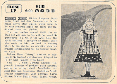 NBC gives us back-to-back specials on Saturday night, preempting Saturday Night at the Movies: first, Tennessee Ernie Ford (8:00 p.m.) hosts an hour of music and "topical comedy" (written by head writer Digby Wolfe, who named and helped create Laugh-In), with special guests Lucille Ball, Andy Griffith and the Golddiggers. That's followed by Jack Benny's Bag (9:00 p.m.), described as a "'with-it' hour for Waukegan's favorite flower child," starring Phyllis Diller (in a spoof of The Graduate) and Dick Clark, and featuring cameos from Jack Lemmon, Walter Matthau and Rowan and Martin. If you're looking for something slightly more serious, check out On the Beach (10:30 p.m., WMT in Cedar Rapids), one of the darknest movies of the decade, starring Gregory Peck, Ava Gardner and Fred Astaire in the story of a world slowly dying following a nuclear war. Be prepared for bad dreams after watching this one.Our Sunday potpourri, in addition to the infamous Heidi, includes the broadcast premiere of The Sons of Katie Elder (8:00 p.m., ABC), starring John Wayne and Dean Martin. Judith Crist calls it "pleasant and lighthearted," and I'd say that's about right. If you want more of The Duke and Dino, the late movie is Rio Bravo (10:45 p.m., KRNT in Des Moines), which also offers us Angie Dickinson, Ricky Nelson, and Walter Brennan. On a musical note, The Smothers Brothers Comedy Hour (8:00 p.m., CBS) presents a show in the round featuring songs from Donovan, Dion, and Jennifer Warren; due to the continuing musicians' strike, the show's music is provided by the Jimmy Joyce Singers.