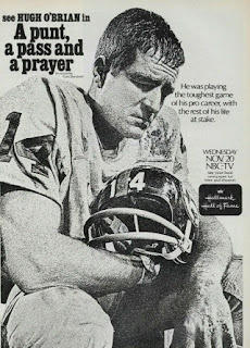 Wednesday night is the season premiere of the Hallmark Hall of Fame (6:30 p.m., NBC) which makes sense since the company's got greeting cards to sell, and Christmas is right around the corner. (There'll be another episode next month, just in case anyone missed the reminder the first time.) This episode is, alas, not one of the series' more distinguished efforts: "A Punt, a Pass and a Prayer," starring Hugh O'Brien as an aging pro quarterback, trying to come back from a serious injury, who refuses to believe the glory days may be over. As a story it has great potential, but it's always difficult to watch actors trying to play athletes, and while the storyline has potential (an aging football star tries to come back from a serious injury), it falls short of what one might have expected from Hall of Fame. Don DeFore, Betsy Palmer, and Shelly Novack co-star. That's followed by a special edition of Kraft Music Hall (8:00 p.m., NBC), as Roy Rogers and Dale Evans host the Country Music Association Awards, including performances by Johnny Cash, Glen Campbell, Jeannie C. Riley, and Tammy Wynette.Thursday is dominated by friendly, familiar names. The episodes aren't themselves particularly special, but the titles are comforting to see: Daniel Boone (6:30 p.m.), Ironside (7:30 p.m.), Dragnet (8:30 p.m.), and The Dean Martin Show (9:00 p.m.) on NBC (the latter with Gordon MacRae, Bob Newhart, Abbe Lane, and Paul Lynde); Hawaii Five-O (7:00 p.m.) and The Thursday Night Movie (8:00 p.m., John Ford's Cheyenne Autumn, with Richard Widmark and Carroll Baker) on CBS; and The Flying Nun (7:00 p.m.), Bewitched (7:30 p.m.), and That Girl (8:00 p.m.) among the offerings on ABC. No specials, just a night of, as my friend David Hofstede might put it, Comfort TV .