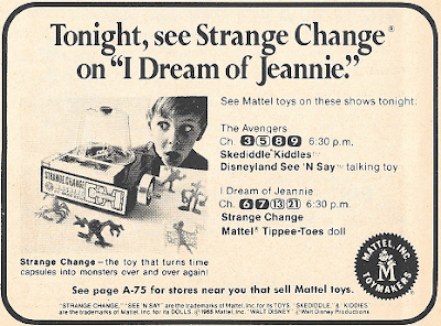 For example, there's this reminder that on Tuesday night, you can catch commercials for Strange Change, "the toy that turns time capsules into monsters over and over again!" on I Dream of Jeannie at 6:30, while Skediddle Kiddles and Disneyland See 'n' Say can be seen on The Avengers, also at 6:30. Incidentally, if you want to see how Strange Change works, or if you had it when you were little and just want to relive the memories, here's a clip of it in action .