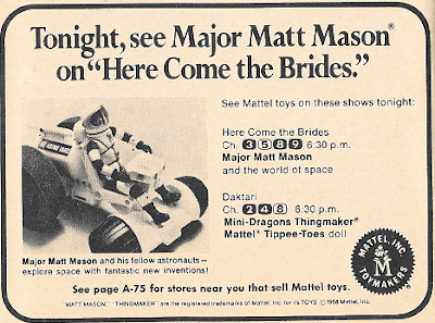 I loved the Matt Mason toys when they came out. I was already a long-term space buff at that point, and I collected all the different astronauts, along with the moonwalker, the space station, the play set, and other things, I'm sure. This could well be the very commercial; I'm surprised they couldn't find a science fiction series to put this on.