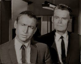 Nick Adams, boy reporter, and his boss, John Larkin Ah, but, you say, star Nick Adams isn't a police detective or a private eye; he's a newspaperman! Correct! But, as Seldes again points out, that angle does work itself into the story: "In order to trick the kidnappers, the paper holds back the story. . . In the case of the racketeers, Nick is ordered by his city editor to lay off and we get some idea of newspaper ethics. In the prison case, Nick is in prison." For refusing to divulge his sources, I hasten to add; Nick may be many things, but a criminal he is not. Also, you might not be surprised to discover, there's only a "faint resemblance" between the actual workings of a newspaper and what we see here. "You can ask that the newspapermen and women resemble human beings and that's exactly what they do in Saints and Sinners—they resemble." They also resemble the kinds of characters you might have expected to see in The Front Page, Deadline U.S.A., and, for that matter, All the President's Men. (I suppose you could throw in Kolchak: The Night Stalker too.)