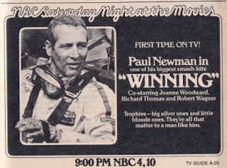 I hadn't particularly planned on writing about movies this week, but there's a surfeit of material here, and another reminder (as if we needed one) as to how much network television has changed without the presence of movies in the weekly schedule. With some help from TV Guide's resident movie critic Judith Crist, we'll look at what the week has to offer, beginning Saturday with the fourth airing of one of the classic made-for-TV movies, Brian's Song (8:30 p.m., ABC), with James Caan, Billy Dee Williams, and Jack Warden. It's not the only sports movie of the night, though, as NBC counters with Winning (9:00 p.m.), a "simple-minded, stale-plotted auto-racing movie" that nonetheless proved a box-office smash with Paul Newman, Joanne Woodward, Richard Wagner, and Richard Thomas, along with a host of real-life racing figures. As an extra reward, it also features an excellent score by Dave Grusin.If you haven't had your fill of Paul Newman yet, you've got two more opportunities on Sunday afternoon's matinee movies, with a choice between his Oscar-nominated perforamnce in Hud (4:00 p.m., WTNH in New Haven) and his take as a cynical private detective in Harper (4:00 p.m., WLVI in Boston) The highlight, though, is the television premiere of Dr. No (9:00 p.m., ABC), the first movie in the James Bond franchise, with Sean Connery unforgettable as the British super-spy, Ursula Andress memorable as Honey Ryder, Jack Lord as the first incarnation of Bond's CIA contact Felix Leiter, and Joseph Wiseman as the refreshingly unexaggerated title character. It's the start of a long and successful relationship between the Bond movies and ABC.