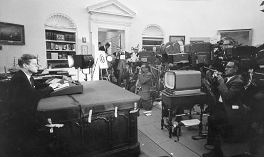 We don't hear a lot about televison coverage of the crisis, primarily because there wasn't a lot of it, at least not compared to what we'd experience today. There were a variety of reasons for this: most of the action took place either out in the ocean, where American warships were in the process of assembling a blockade of Cuba, or behind closed doors in Washington and Moscow. There were no remotes, no on-the-spot lcoverage, no journalists embedded in combat units—a drawback for a medium based on visuals. There was also an embargo of official statements from government officials, which network news heads vigorously protested, limiting the news flow even further. Compared to the non-stop coverage we'd have today, with reports of the world "on the brink," talking heads analyzing the situation 24/7, and continuous video loops of ships circling at sea, I'm not sure we weren't better off with limited television presence. You can imagine the frenzy of anxiety it would have produced.