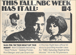 It may seem odd that one of the big attractions of the new TV season is the theatrical movie, but this is the way it is before cable, before streaming, when Hollywood's biggest hits used to take years to make it to your living room set. The action starts right away, with NBC rolling out In the Heat of the Night, winner of five Academy Awards including Best Picture, on Saturday night (9:00 p.m. ET) Sterling Silliphant won an Oscar for his screenplay adaptation, and in doing so demonstrates something he must have learned from Naked City: if you're going to do a genre story, no matter what kind of message you want to send, you're still going to have to respect the demands of the genre at the same time. Indeed, although In the Heat of the Night is about race relations, ignorance and prejudice, and the old south coming to terms with a new world, Judith Crist reminds us that it still succeeds as a top-notch whodunit. Of course, having Sidney Poitier and Rod Steiger in the cast doesn't hurt.