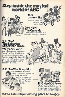 Not to be left out, ABC rolls out its new Saturday morning lineup this week, apparently making it the "place to be," at least on Saturday mornings. Compared to cartoons of the past, some of which can still be seen Saturdays on other networks, this lineup strikes me as—what? Trendy, taking advantage of headlining music groups? (The Jackson 5ive, The Osmonds.) Cynical, spinning off from the network's own primetime shows? (The Brady Girls, with magic myna bird and pandas thrown in for good measure.) Unimaginative, regurgitating some of those old, favorite characters in an hour-long story with a social message? ("Yogi Bear, Huckleberry Hound, Quick Draw McGraw, Top Cat, Magilla Gorilla and his other animal friends sail away from Jellystone National Park to escape pollution.") Perhaps all three? It strikes me that this would have been about the time I stopped watching Saturday morning cartoons, which is a shame because I still enjoy the best of them (Rocky and Bullwinkle, Alvin, Felix the Cat, Bugs Bunny), but I'm afraid most intelligent children will see right through some of this claptrap.l l l