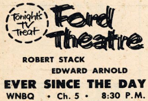Thursday stars off with Groucho Marx and You Bet Your Life (7:00 p.m., NBC), and continues with Four Star Playhouse (7:30 p.m., CBS), starring Dick Powell as a weary police detective who arrives home after a day in which he was forced to shoot a suspect; later in the evening, he discovers someone has stolen his gun. At 8:00 p.m. it's Dragnet (NBC), with Friday discovering that a robbery suspect is an old Army friend. Ford Theater (the show, not the building) returns at 8:30, with Robert Stack starring in "Ever Since the Day," the story of an Army vet who returns from Korea but has difficulty adjusting to civilian life, and at 9:00 it's The Lone Wolf (WGN), a sneaky-good syndicated series that's kind of an American version of The Saint, with Louis Hayward very good as jewel thief-turned-private detective Michael Lanyard. Prime time ends as it began, with a quiz show: Bill Cullen hosting Name That Tune. (9:30 p.m., CBS)I always enjoy checking in with Edward R. Murrow's Person to Person, which airs Friday at 9:30 p.m. on CBS; it's a useful barometer for telling what celebrities are hot, and what stories are in the headlines. This week, the celebrity guest is actress Eva Marie Saint; later, Murrow visits the Washington, D.C. home of Agriculture Secretary Ezra Taft Benson. One guest you won't see with Ed is the notorious Keefe Brasselle , "popular young star of The Eddie Cantor Story," who hosts a variety special on NBC at 7:30 p.m.