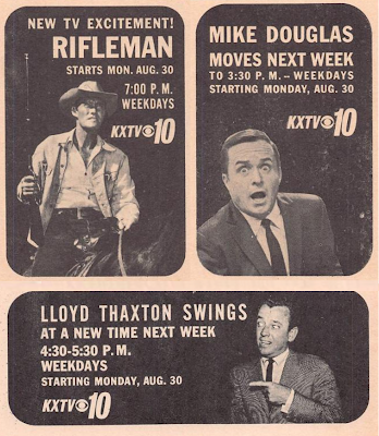 KXTV, the CBS affiliate in Sacramento, has some changes in store next week. The newcomer to the daily schedule is The Rifleman, and its 168 episodes; the 6:00 p.m. local news will now be seen at 5:30. Meanwhile, The Lloyd Thaxton Show moves up an hour, from 5:30 to 4:30 p.m., and The Mike Douglas Show, cut back from 90 minutes to an hour, will now air at 3:30 p.m., bumping Dobie Gillis. Ah, Dobie, good thing you've got so many loves to fall back on.Even more than specific shows, though, the big change in the air is COLOR. KPIX, San Francisco's CBS affiliate, cashes in on the spy craze with the kickoff of the new season on September 12, the first season in which a majority of CBS programs—including Andy Griffith, Red Skelton, Petticoat Junction, The Beverly Hillbillies, and Gilligan's Island—are broadcast in color.