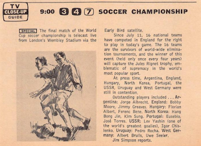 The weekend begins with the world's biggest single-day sporting event, the World Cup soccer final, shown for the first time ever on American television in a same-day broadcast from Wembley Stadium in London, via Early Bird satellite. (Saturday, 9:00 a.m. PT, NBC) The TV Guide Close-Up says it's live, but other sources say it's on a two-hour film delay; my own research indicates that NBC broadcast the match simultaneously in all time zones, and a 9:00 a.m. PT start translates to 5:00 p.m. in London. Since the kickoff actually occurred at 3:00 p.m. over there, this tends to confirm the film-delay theory. I like the idea that it was live, though.Regardless, it's quite a debut for the sport. The match, played before a crowd of nearly 100,000 (including Queen Elizabeth) pits home favorites England against West Germany. "I After regulation time ends with the match level at 2-2, England scores twice during the 30-minute extra time to win 4-2.* With England's recent loss to Spain in the European Championships, this remains the country's only major international tournament victory. And despite the growth of soccer in the United States, the World Cup final wouldn't be shown live on broadcast television (or even same-day) until 1982.