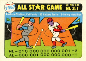 Unfortunately, starting the game at that hour produces some unintended side-effects, chief among which is that the late-afternoon sun is right in the batter's eye for much of the game. The National League scores in the top of the second, the American League ties it up in the bottom of the sixth, and there it remains for awhile. Quite awhile, in fact. It isn't until Tony Perez' home run in the top of the 15th inning, almost four hours later, that the National League wins the snoozer, 2-1. The game sets records for most strikeouts (30, as every one of the game's twelve pitchers records at least one strikeout) and innings played, and is the first All-Star game in which every run is scored via home run. Had the game simply started at the usual time for a game being played in the Pacific time zone, it would have made it into prime time in the East anyway. This year's game is the middle edition in a troika of dismal Midsummer "Classics"; last year's affair, played in the afternoon in St. Louis, featured a game-time temperature of 105° (turning the stadium, according to the St. Louis Post-Dispatch, into a "torture chamber"), while the 1968 contest, another prime-time game played in the air-conditioned comfort of the Houston Astrodome (where the angle of the sun won't make a difference) will be yet another dull clash, won by the National League 1-0 via a first inning run scored on a double play. Except for 1969, when the game is played on Wednesday afternoon due to rain, the game will remain in prime-time thereon.