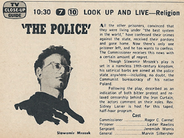 This week's other blast from the past comes courtesy of CBS' Sunday morning religious series Look Up and Live (10:00 a.m.) that, with few adaptations, could be presented today. "The Police," based on the play by Polish writer Slawomir Mrozek, tells the story of a prison rapidly losing its reason for being. "All the other prisoners, convinced that they were living under 'the best system in the world,' have confessed their crimes against the state, received their pardons and gone home. Now there's only one prisoner left, and he too wants to confess. The Commissioner receives this news with a certain amount of regret."Mrozek, often compared to the Absurdist playwright Eugène Ionesco, is a fascinating character himself. He was once an ardent Communist, praising Polish authorities for their persecution of religious leaders, and took part in demonstrations defaming Catholic priests. Following his defection from Poland in 1963, he became a harsh critic of Communism. The always-reliable Wikipedia offers this quote from him, explaining the change: "Being twenty years old, I was ready to accept any ideological proposition without looking a gift-horse in the mouth—as long as it was revolutionary. [. . .] I was lucky not to be born German say in 1913. I would have been a Hitlerite because the recruitment method was the same." "The Police" was published in 1958, bearing the marks of his growing skepticism of totalitarianism. I wonder what he'd think about the world of today? TV