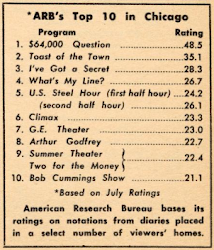 Curious as to what's popular on TV in Chicagoland? Well, wonder no more; American Research Bureau, which used to provide the ratings for the networks, is out with their Top Ten list for July, and, to nobody's surprise, The $64,000 Question sits on top of the heap, well ahead of Ed Sullivan's Toast of the Town. CBS and NBC dominate the ratings, with ABC's U.S. Steel Hour the highest-rated show on the lowest-rated network. The $64,000 Question is also the nation's number one show, based on the Trendex ratings, followed by I've Got a Secret, Toast of the Town, Two for the Money, and G.E. Theater. By the way, according to the Teletype, Toast of the Town has a change upcoming; starting with the new season, it will henceforth be called The Ed Sullivan Show. Elsewhere, if you're wondering why Audie Murphy's been so active on TV this week, it's probably because he's promoting his new movie, To Hell and Back. And Jim Backus is on the lookout for one of those sound-proof booths like the kind you see on Question, "For my mother-in-law."