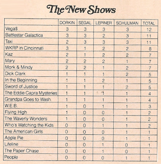 Among those looking at the new season is our erstwhile critic, Robert MacKenzie. He's not offering any reviews, not yet anyway; too early for that, and some of these shows won't be on long enough to be reviewed anyway. Curiously, though, he sees a number of the 21 shows as "unusually promising"—on paper, at least. He likes the idea of Lifeline, and the rise of nonfiction television in general, although I suspect he might have had second thoughts had he seen these quasi-documentaries morph into unscripted "reality" television that, in reality, was anything but. He praises NBC's Fred Silverman for his commitment to "More prime-time news specials and documentaries," although perhaps their most interesting documentary would have been one explaining how a program like Supertrain gets greenlighted for the second season. He's also encouraged that television has finally come to realize that shows can be set in cities other than New York or Los Angeles, as evidenced by The Paper Chase (somewhere in the Northeast), Vega$ (Las Vegas), WKRP in Cincinnati (Cincinnati), and Battlestar Galactica (outer space). Just for good measure, he throws in W.E.B., a show that "threatens to take us inside the world of network broadcasting." (At five episodes, I wonder if he got a chance to review it?) Well, he does warn us that "This will not be a comedy, unless unintentionally."