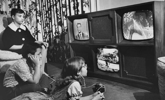 That looks like the coolest TV setup, doesn't it? It reminds me of fall Sundays back when I was a kid, when I'd bring a portable set out from the bedroom and put on top of the console in the living room, so I could watch two football games at once. Whenever one of them looked like it was getting interesting, I'd turn up the sound on that one and turn it down on the other. I don't watch football anymore, and I don't miss it—but I do miss memories like that.