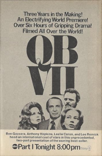 I'm not quite sure why QBVII isn't better-remembered. Perhaps it's because it was so quickly overshadowed by the epic miniseries craze, Rich Man, Poor Man, Roots, Holocaust and the others that came afterward. It has the right pedigree, for sure: based on the best-selling novel by Leon Uris, featuring an all-star cast led by Ben Gazzara, Lee Remick, Anthony Hopkins, Leslie Caron and Anthony Quayle*, with a huge budget ($2.5 million), an international flavor (filmed in four countries) an epic story (spanning 25 years, taking three years to produce), a script from a big-name author (two-time Oscar winner Edward Anhalt), and the largest cast (167 speaking roles) ever assembled for a television production. And it all comes to TV this week (Monday, 8:00 p.m. CT, Tuesday, 7:30 p.m., ABC)*Ben Gazarra, fresh off Run For Your Life, was actually a bigger star in America at that point than Anthony Hopkins, who was primarily known for the movie The Lion in Winter and the Masterpiece Theatre series War and Peace—which, coincidentally, is airing in repeats Saturday nights on KTCA, the PBS affiliate.