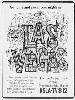 in the past, the fourth network wannabe that started life as the Overmyer Network and ended life after one month of programming. The first and only program to be carried on United was The Las Vegas Show, a two-hour talk-variety show hosted by Bill Dana, which premiered on May 1. On Monday, KLOC, the independent station in Modesto, signs on to The Las Vegas Show, carrying it at 8:30 p.m. PT. It was envisioned as a challenger in the late-night sweepstakes, but, as we can see here, scheduling was all over the map, with some stations (such as KLOC) carrying it in primetime, and others even showing it in daytime. (As you can see from the ad at the left, the show was a goodfit for CBS affiliates lacking a late-night show of their own.) The show, and the network, ended abruptly on June 1; Dana would memorably quip later that "I'm the first man in history to sink an entire network." Robert has