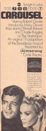On Sunday, Robert Goulet and Mary Grover star in a television adaptation of Rogers and Hammerstein's "Carousel" (9:00 p.m.), part of ABC's revival of Armstrong Circle Theatre as a series of occasional specials. Pernell Roberts and Charlie Ruggles are part of the supporting cast. You can see it