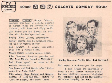 Armstrong Circle Theatre isn't the only Golden Age show being dusted off this week; on Thursday, the Colgate Comedy Hour makes a return, with a contemporary twist courtesy of producer George Schlatter (10:00 p.m., NBC). Among the acts are Rowan and Martin (a preview of next year's Laugh-In?), Shelley Berman, Bob Newhart, Carl Reiner and Mel Brooks (doing the 2000-year-old man bit), Dick Shawn, Phyllis Diller, and more. It's up against ABC Stage 6 and the musical revue "Rodgers and Hart Today" (10:00 p.m.), with Petula Clark, Bobby Darin, the Supremes, the Mamas and the Papas, the Doodletown Pipers, and Count Basie and his orchestra. And don't dismiss F Troop earlier in the evening, with guest star Milton Berle as Wise Owl (8:00 p.m.).