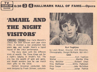 Well, if you want Christmas programs, you've come to the right place. starting on Saturday as The King Family presents the first of three Yuletide-themed shows (8:00 p.m. PT, ABC) with "Jolly Old St. Nicolas," "Santa Claus is Coming to Town," and "Holiday of Love"; that's followed at 8:30 p.m. by The Lawrence Welk Show, and while the maestro's actual Christmas episode isn't for a week or two yet, there's plenty of seasonal sounds tonight, including "Winter Wonderland," "Silver Bells," and "Frosty the Snowman." Then, on Sunday afternoon, it's an hour of Christmas cartoons featuring "The yuletide adventures of Hoppity Hooper, Commander McBragg and Dudley Doright." I don't think I've ever seen that collection. (4:00 p.m., ABC) Sunday evening's highlight is NBC's 15th annual presentation of Gian Carlo Menotti's opera Amahl and the Night Visitors on the Hallmark Hall of Fame. (6:30 p.m.) It will be the third year using the new, videotaped production that debuted in 1963—much to Menotti's dismay. The production featured a new cast, set, and staging, and was done while Menotti was out of the country; when the rights to the opera revert to him following the 1966 broadcast, he'll withdraw permission from NBC to air the program. It will remain off the air until the 1970s, until it returns in yet another new production, this time supervised by Menotti.