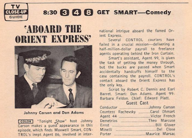 There's some other fun stuff on TV this week, starting on Saturday, with the Get Smart episode "Aboard the Orient Express" (8:30 p.m. PT, NBC), best known for the cameo appearance by Tonight Show host Johnny Carson as the train's "Special Guest Conductor." (You can