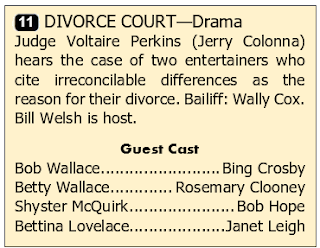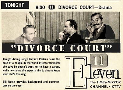 Bill Welsh: This week on Divorce Court, we bring you a case from the world of entertainment, between two singers whose marriage appears to have hit a sour note: Bob Wallace, famous song-and-dance man, successful Broadway impresario, one-half of the act of Wallace and Davis, versus Betty Haynes Wallace, part of the Haynes Sisters, appearing in many of the shows of Wallace and Davis. Presiding is Judge Voltaire Perkins.