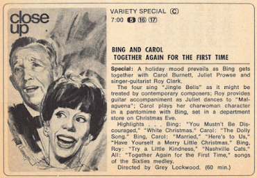 Well, if you want Christmas programs, you've come to the right place. starting on Saturday as The King Family presents the first of three Yuletide-themed shows (8:00 p.m. PT, ABC) with "Jolly Old St. Nicolas," "Santa Claus is Coming to Town," and "Holiday of Love"; that's followed at 8:30 p.m. by The Lawrence Welk Show, and while the maestro's actual Christmas episode isn't for a week or two yet, there's plenty of seasonal sounds tonight, including "Winter Wonderland," "Silver Bells," and "Frosty the Snowman." Then, on Sunday afternoon, it's an hour of Christmas cartoons featuring "The yuletide adventures of Hoppity Hooper, Commander McBragg and Dudley Doright." I don't think I've ever seen that collection. (4:00 p.m., ABC)